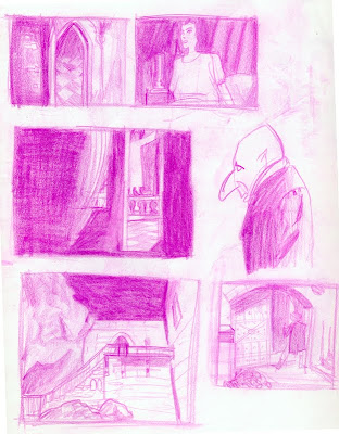 Sorry for the small size of the drawings below. They're larger if you click on the image. This is the middle part of the movie, where Jonathon is confronting the vampire and Nina, through some mystic psychic connection, tries to go to Jonathon in her sleep. Every shot looked like a painting. Unfortunately, the youtube copy of Nosferatu I was watching had a kind of farty-sounding oboe providing the soundtrack for this part, which damaged the intense emotional pitch the visuals were creating.
